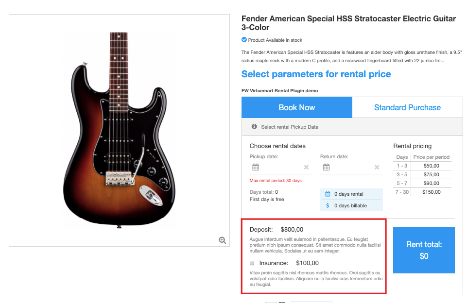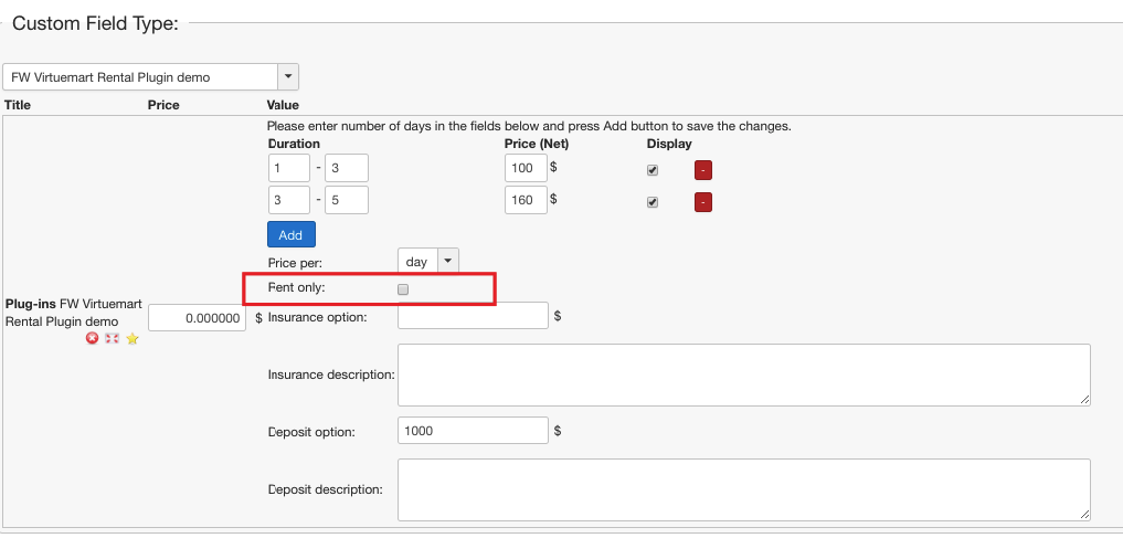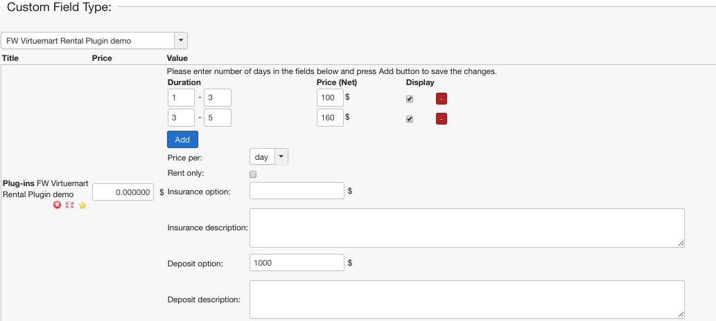 In some cases, security deposit and/or insurance amount is predefined by rental terms. FW VM Rental plugin allows to specify deposit and/or insurance amount in the Custom field section of the product settings. Additionally, you can specify here your deposit/insurance terms in the description field available for each option. -https://demo.fastw3b.com/vmrental/administrator/index.php?option=com_virtuemart&view=product&task=edit&virtuemart_product_id=1.