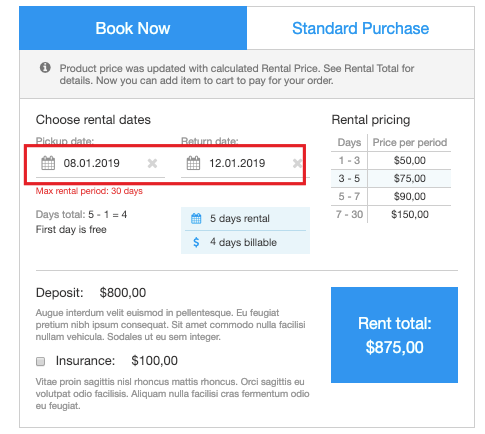 Managing your rental business is easy with FW VM Rental plugin. It offers a bunch of helpful features to help you make your product page informative and compelling for selling and/or rent. Let’s review the plugin’s features in the following order.