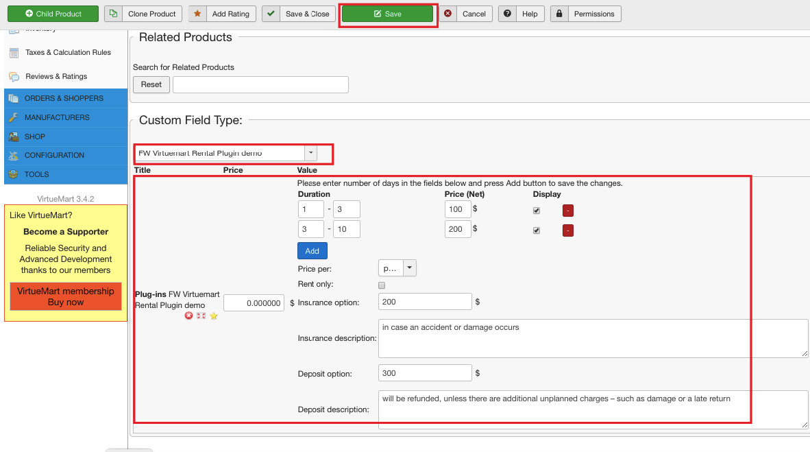 Locate Custom Field tab. Choose the custom field we have created in the Custom Field Type dropdown. As a result, FW VirtueMart Rental plugin parameters show up. These parameters are applied only to the product being added. Set the parameters as is shown on the screenshot below. Check out our How to add a product with FW VM Rental tutorial for more information about each plugin parameter.