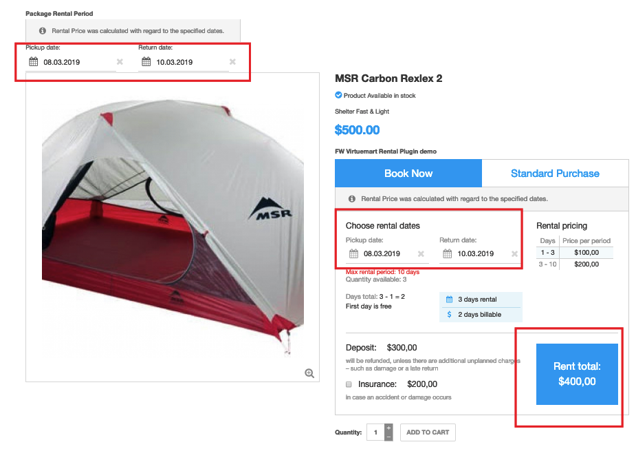 Our showcase is dedicated to package rentals. FW VM Rental Dates Module allows for quick renting of several products at a time, on the same dates. Thus, once the dates are entered within the module, they are automatically filled within the plugin for each particular product, and the total rental price gets automatically calculated as well. So you don’t need to rent out each product one by one.