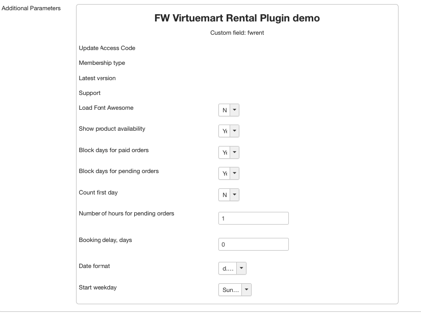 Once the Plugins type is chosen, FW Virtuemart Rental plugin appears in the Additional parameters dropdown. Set FW Virtuemart Rental plugin parameters as is shown on the screenshot below. Make sure to understand that these settings will be applied to all products on your website. Check out our Plugin settings tutorial for more information about each plugin parameter.
