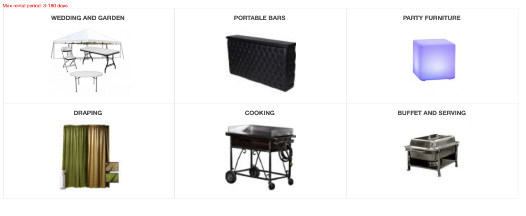Page with party rental categories