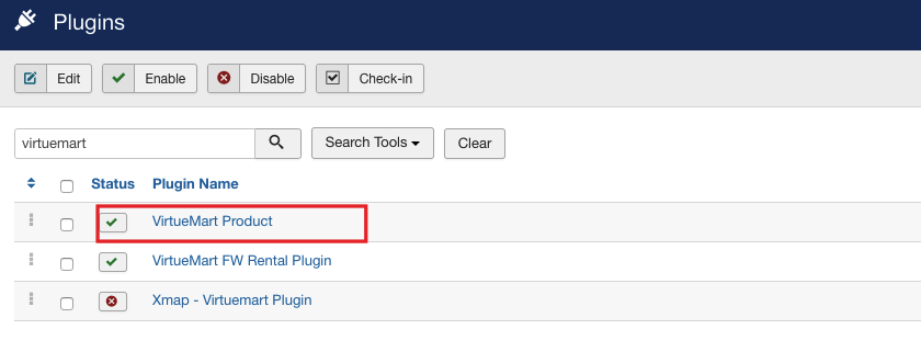 Make sure that VirtueMart Product plugin is enabled in order to insert a product created via VirtueMart component into your Joomla website. To learn how to enable VirtueMart Product plugin, review steps 6-9 of How to install tutorial. Do exactly the same, but with VirtueMart Product plugin.