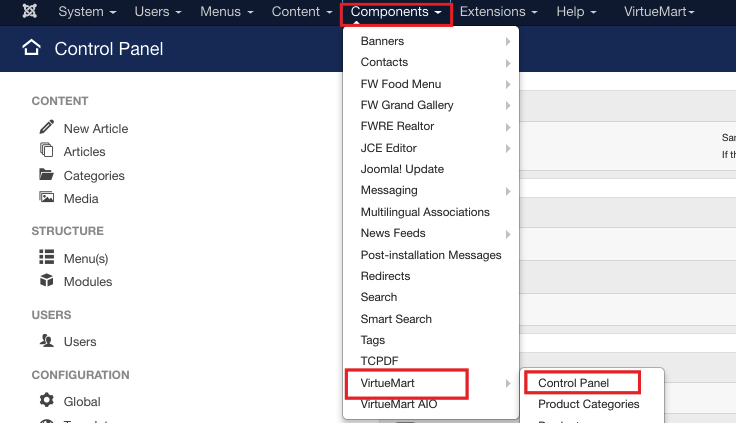 Choose VirtueMart=>Control Panel from the list.