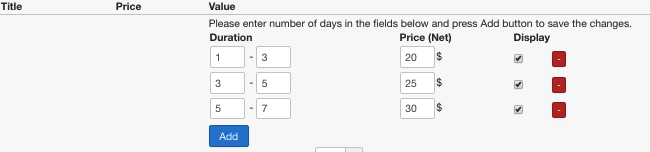 Click Add button and fill in Duration and Price columns as is shown on the screenshot below, the same way we did for steps 4-6. Your screen should look similar to the screenshot below.
